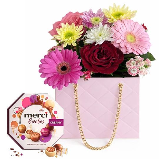 Un cadeau élégant qui fait toujours plaisir Un magnifique bouquet de fleurs présenté dans un sac rose chic avec une chaîne dorée ✨ Parfait pour offrir à une personne spéciale : anniversaire, surprise ou simplement pour faire plaisir Largeur 15CM Longueur 18CM